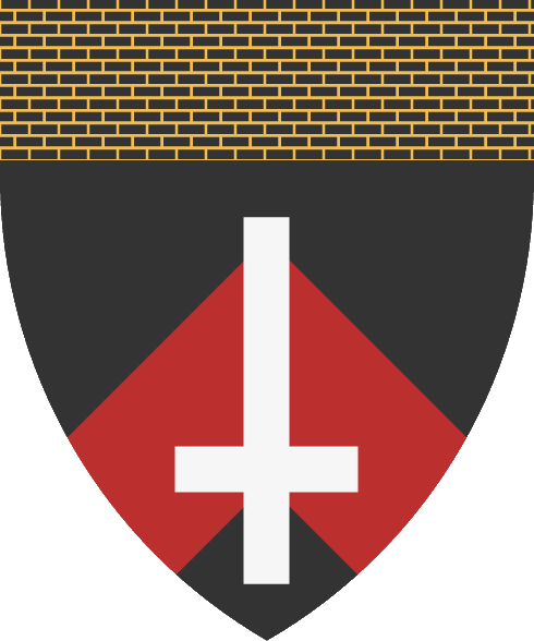 De sable, un cabrío de gules, brochante una cruz latina ranversada de plata, el jefe de sable mazonado de oro |