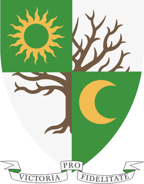 “De plata un árbol arrancado y deshojado de leonado, sobre el todo el cuartel diestro superior de sinople, una estrella ondada de 16 rayos vacía de oro, y el cuartel siniestro inferior de sinople, un creciente contornado de oro. Por lema: ‘VICTORIA PRO FIDELITATE’”