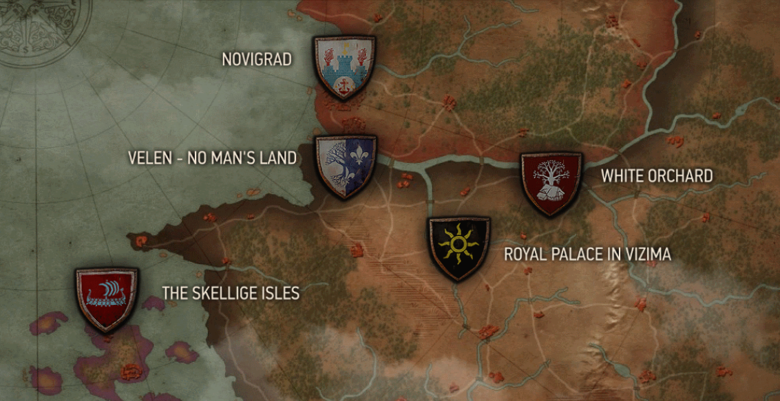 Durante el juego recorreremos 6 áreas (sin considerar los DLC), y en el mapa 5 de ellas se encuentran identificadas con un escudo: